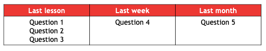 For example, if there are five questions in a quiz, three of these might relate to the previous lesson, one to a lesson from last week, and one to a lesson from longer ago. I once observed a teacher who used a template to help them do this as a matter of routine:
